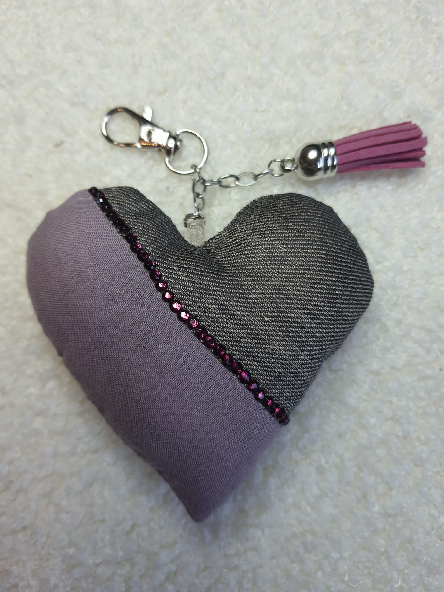 • Porte-clés cœur cousu main en coton upcyclé violet et denim gris scintillant, avec une finition strass rose pour un effet bijou chic.